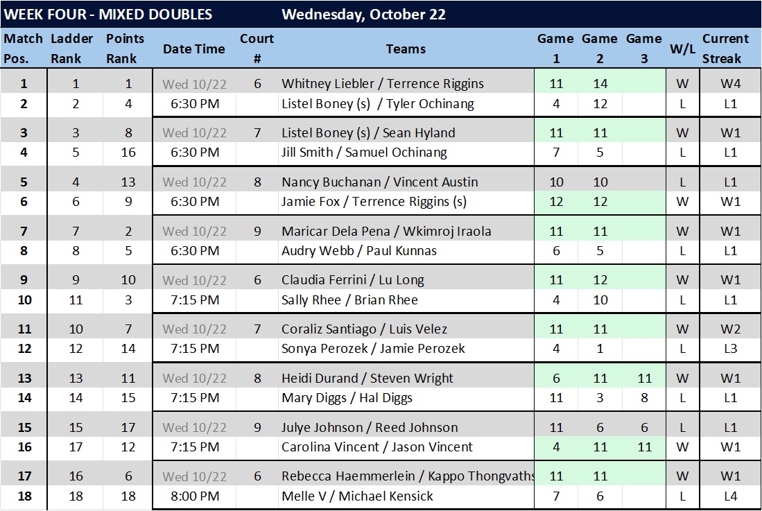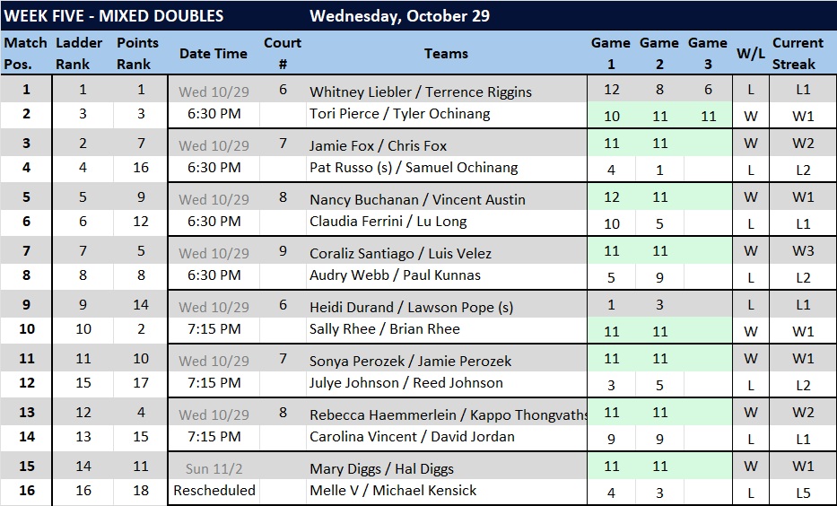 Congratulations to the winners of The Picklr's Fall mixed doubles league: gold medalists Tori Pierce and Tyler Ochinang, silver medalists Whitney Liebler and Terrence Riggins, and bronze medalists Coraliz Santiago and Luis Velez.